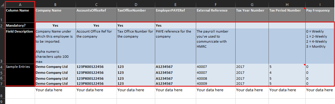 The import template will have the examples, description, and mandatory fields that need to be filled. The examples (Sample Entries)and explanation column should be deleted before importing the file.